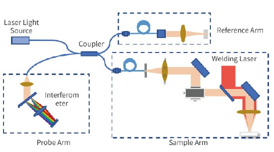 Laser welding depth of fusion detection relies on optical coherence tomography (OCT) technology. When the optical range difference between the signal returned from outside the weld and the reference signal is within the light source’s coherence length, an interference phenomenon occurs. This allows the extraction of the weld depth of fusion information for imaging. OCT provides real-time, high-resolution, non-invasive measurement of the material’s internal structure, leading to more accurate, efficient, and higher-yield welding processes with better control.
